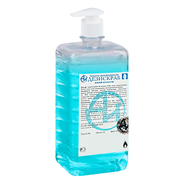 Дезискраб кожный антисептик 1 л применяется в гигиенической обработки кожи рук или ног, в обработке рук хирургов, операционного и иньекционного поля, ногтевой пластины. Активен против бактерий, включая микробактерии туберкулеза, вирусы, включая гепатиты (А, В и С), ВИЧ, полиомелит, аденовирусы "атипичной пневмонии" (SARS), свиного гриппа А/Н1N1, гриппа человека, герпеса и др., грибы рода Кандида и Трихофитон.